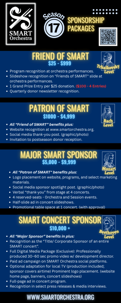 We accept checks payable to SMART Orchestra! You may mail checks to SMART Treasurer, 172 Discovery Lane, San Marcos, TX 78666. Thank you for supporting our 501(c)(3) non-profit organization. All contributions are tax-deductible.